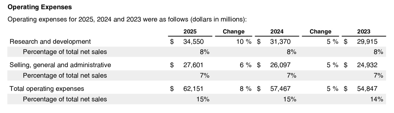 蘋果主要有兩類Operating Expenses,分別為研發開支及銷售、一般及行政,這兩項也是幾乎所有公司年報常見的