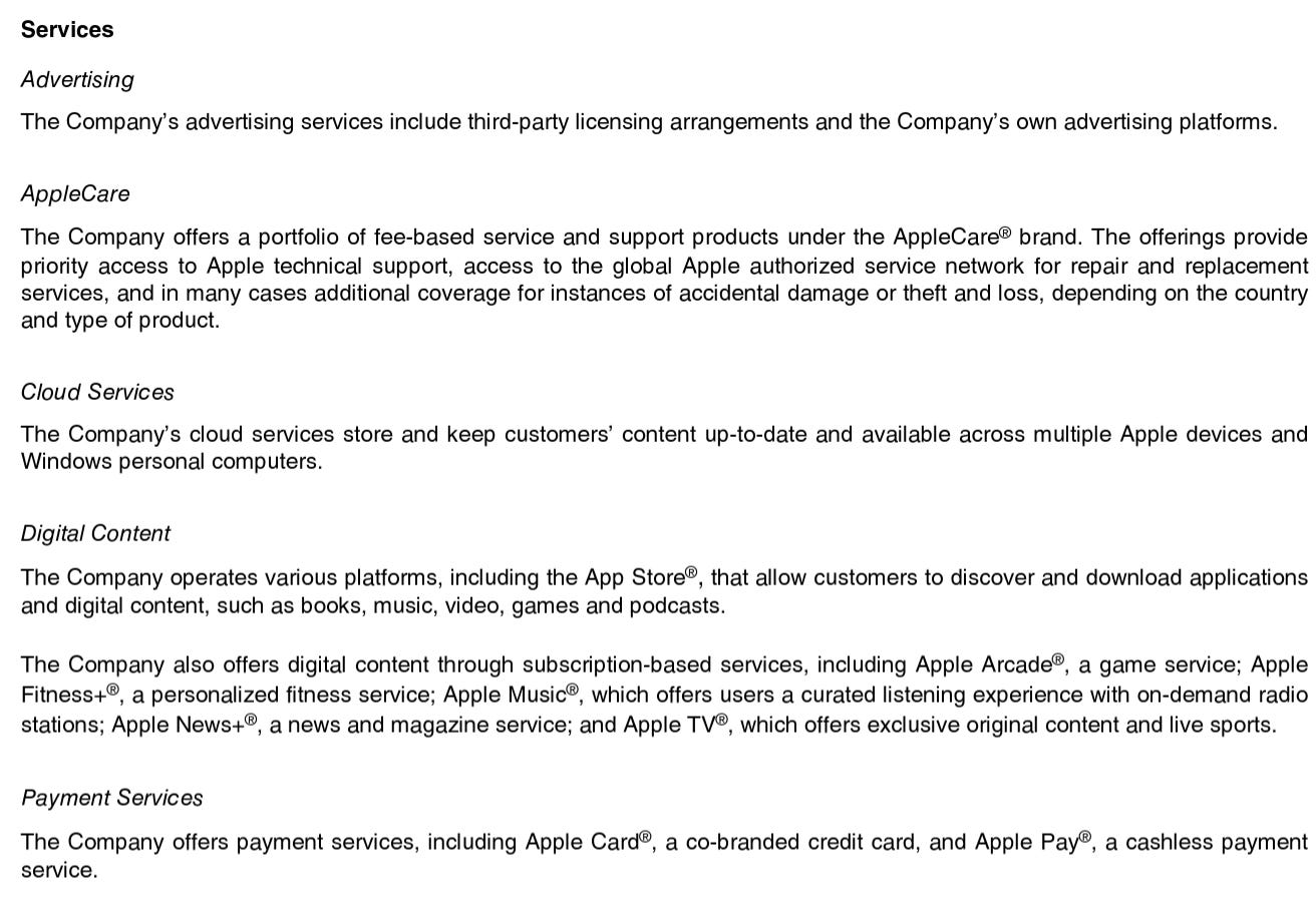 Services 包括: Advertising AppleCare、 Cloud Services 、 Digital Content,以及Payment Services