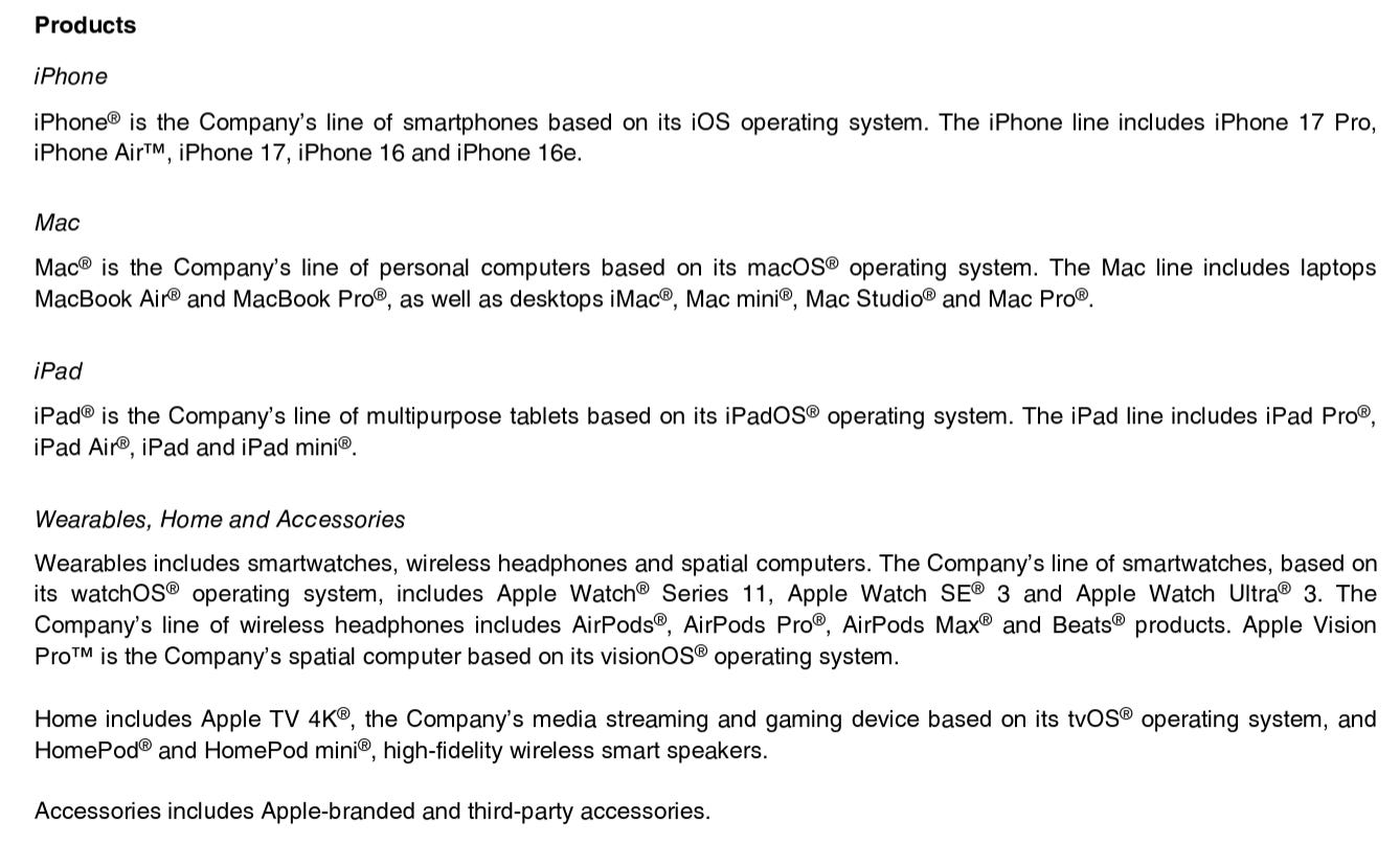 Products 包括:iPhone、Mac、iPad、Wearables, Home and Accessories