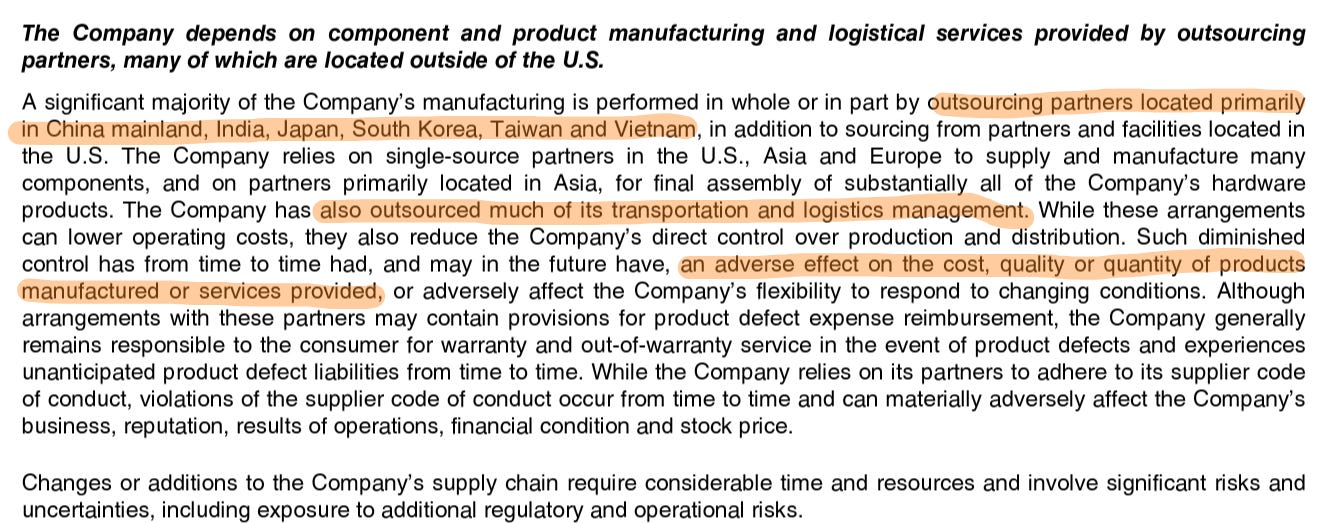 舉個簡單例子,下圖就反映了蘋果的零件製造和物流需要由來自美國以外的生產商供應,可能會產生供應不穩的情況