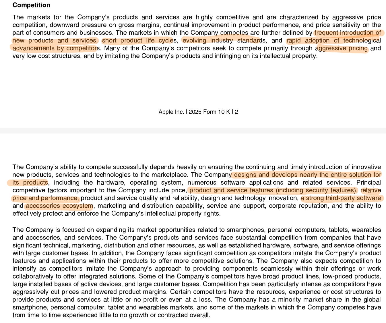 一般而言,公司都會提出自己在競爭的位置,又或如何應對競爭:蘋果的講法就是持續推出創新產品、自主設計幾乎所有產品的解決方案,包括硬件、軟件、作業系統等